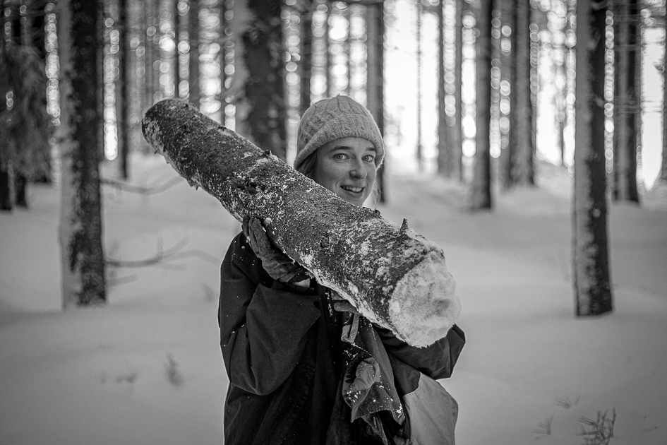 • Nina carrying a log foraged from the depths of the wood. Every visitor tries to bring something up to The Shack, and there’s no lack of hands helping with harder tasks.